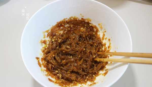 3,粉条煮至没有硬心,捞出用厨房剪刀剪碎,或者放在菜板上切碎。加老抽、花椒粉、葱末、姜末,再倒入热油激发出香味。充分拌匀。
