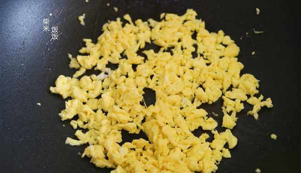2,鸡蛋打入碗中,充分搅散。热锅倒油烧热,把鸡蛋液倒进来,大火快速滑炒,将鸡蛋炒熟炒碎,冷凉备用。