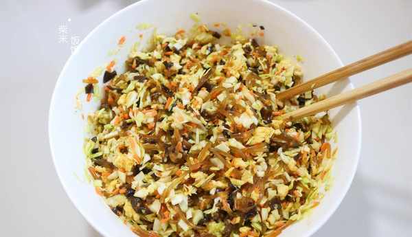 馅料的调制也比较简单,我用的是包菜、粉条、鸡蛋,木耳和胡萝卜大家根据自己的喜欢酌量搭配就好。馅料灵活随意,包菜还可以换成大白菜、西葫芦等等,但是水分高的蔬菜需要用盐腌一会,去掉多余的水。