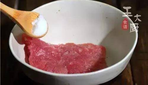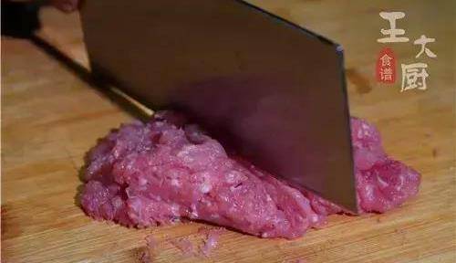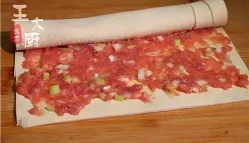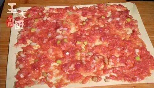 8、豆皮平铺在案板上,肉馅放在上面抹平。