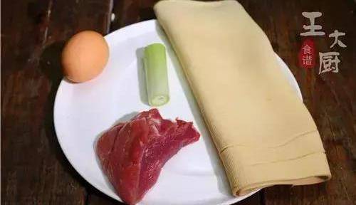 1、准备豆皮1张,瘦肉1小块,大葱1小段,鸡蛋1个。