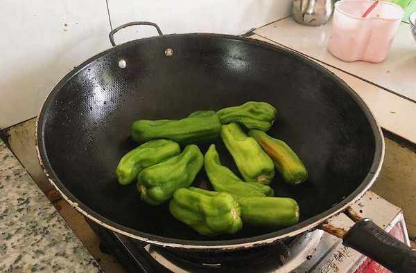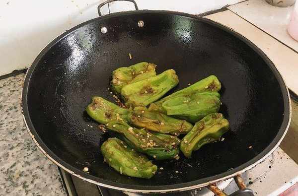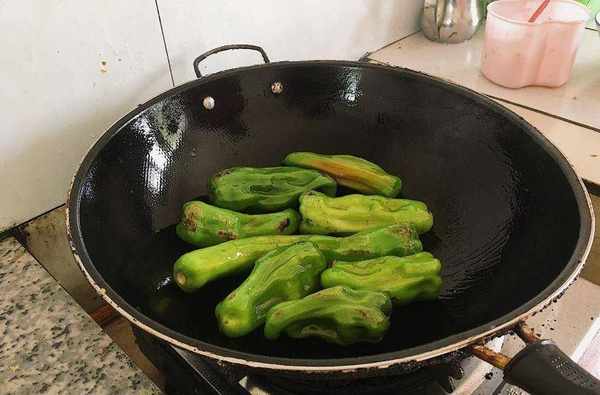 2️⃣热锅内无水无油,放入青椒,用锅铲按压帮助表皮煎枯;