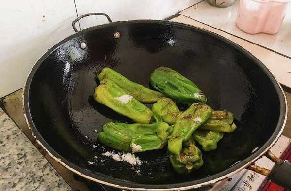 4️⃣撒入适量食盐,翻动辣椒,混合均匀,继续慢煎;