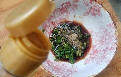 在蒸的同时准备酱料,一点好,一点盐,一点点香油,少许花椒,生抽少许醋,用筷子搅拌均匀