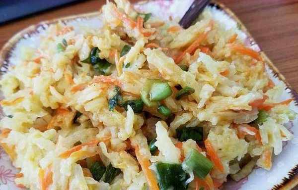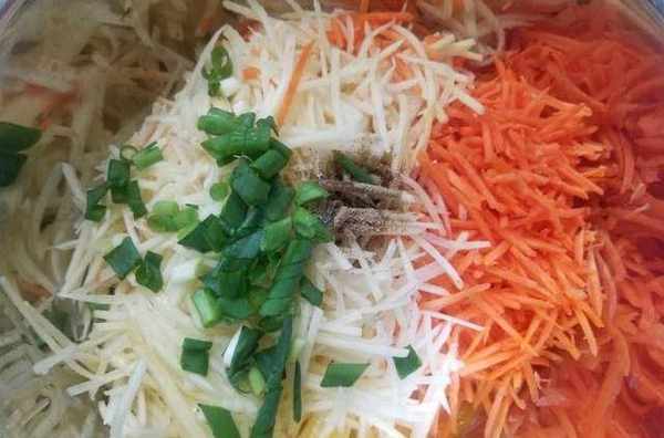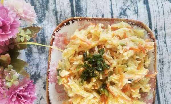 土豆和胡萝卜丝,里面加入少许花椒,葱花,食盐,打一颗鸡蛋,