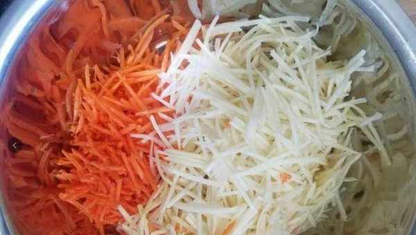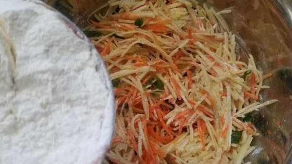 土豆削去皮,在水里面泡一下,然后把土豆擦丝儿,另外胡萝卜也是去皮擦丝,
