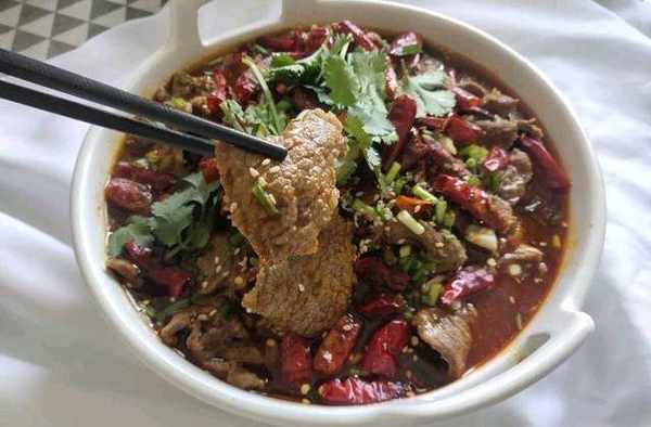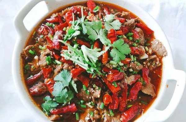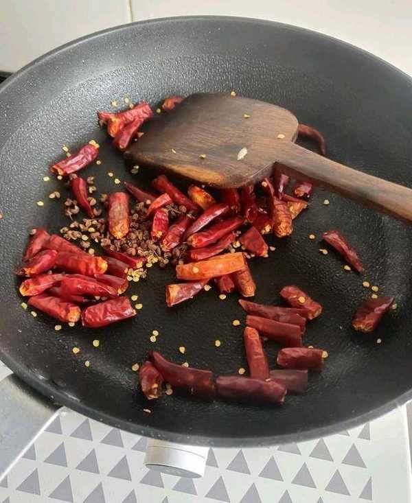 锅中放入干辣椒白芝麻和花椒干炒,炒出香味后撒在汆好的牛肉喷中