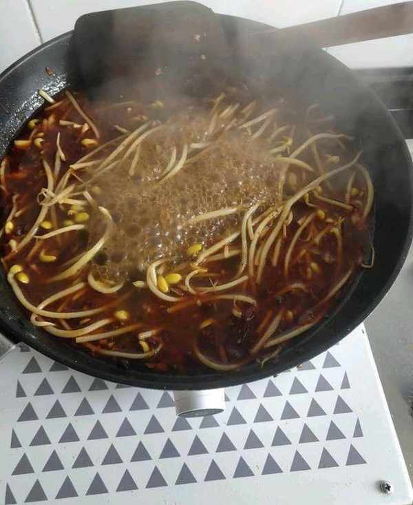 依次放入豆芽菜和尖针菇肏熟后捞出放入盆中备用,再放入腌好的牛肉汆2到3分钟捞出放在之前的豆芽和尖针菇上面将汤倒入