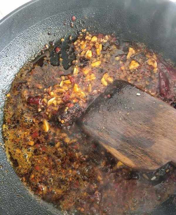 锅中放油烧热加入豆瓣酱火锅底料花椒干辣椒,蒜末姜末炒出红油和香味加入白开水