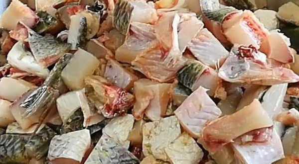 第二步、个半小时后,捡出鱼块里面的调料,倒去多余的汁,然后撒上适量干淀粉,拌匀备用。
