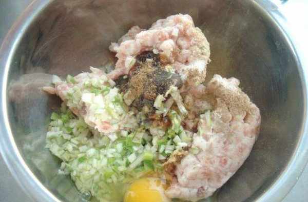 2.肉末里放入盐,胡椒粉,料酒,葱末,姜末,生抽,蚝油,香油,鸡蛋和少许花椒熬的水朝一个方向搅打上劲。
