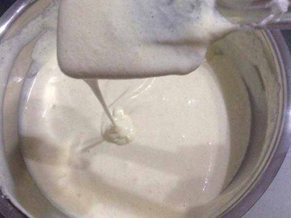 (3)打发至膨胀浓稠,提起打蛋器滴落的蛋液不会马上消失为止;