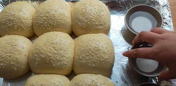 14、发酵完成后,在表面洗一层蛋黄液,撒上一些白芝麻,然后在烤盘上放一小碗热水。这样做的目的是防止表面在烘烤过程中变干。