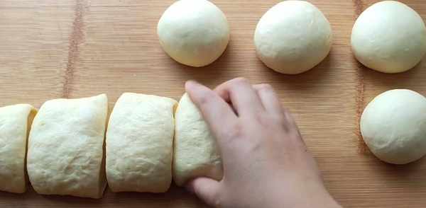 10、移到案板上,稍微压一下空气,排成长条。分成八等份。
