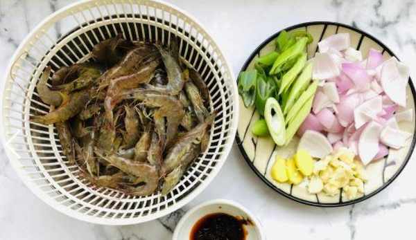 我们需要准备一些大虾,大葱,生姜,大蒜,洋葱,料酒,白糖,香辣酱,食用盐,食用油。