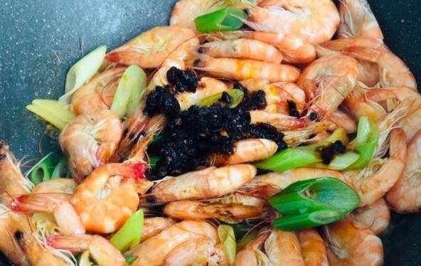 6. 接下来也就可以直接把我们已经准备好的大虾倒入到锅里边一起翻炒。