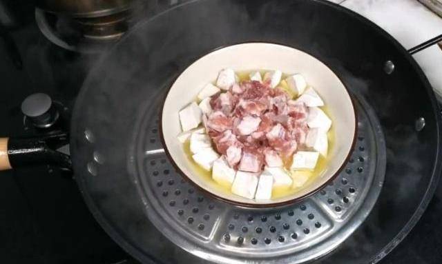 3.锅中烧水放入篦子,水开后放入香芋和排骨,将刚刚调好的汁倒入碗中。