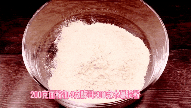 2倒入200克面粉,200克木薯淀粉,加4克酵母。