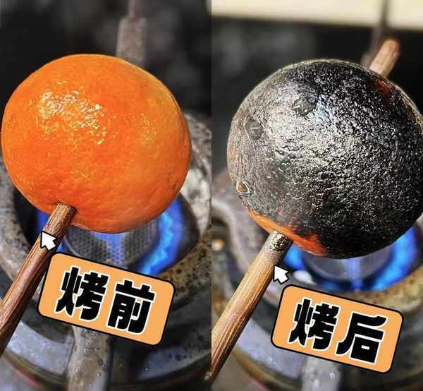 3:不停转动橘子,烤至橘子皮全黑为止即可