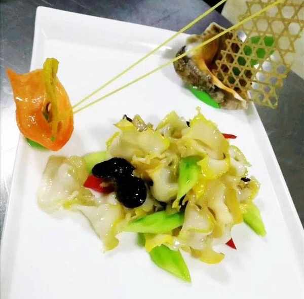 海螺1000克、青瓜片50克、木耳20克、红椒片适量、盐、糖、醋、豆瓣、葱、蒜片、芡粉、明油、文蛤精