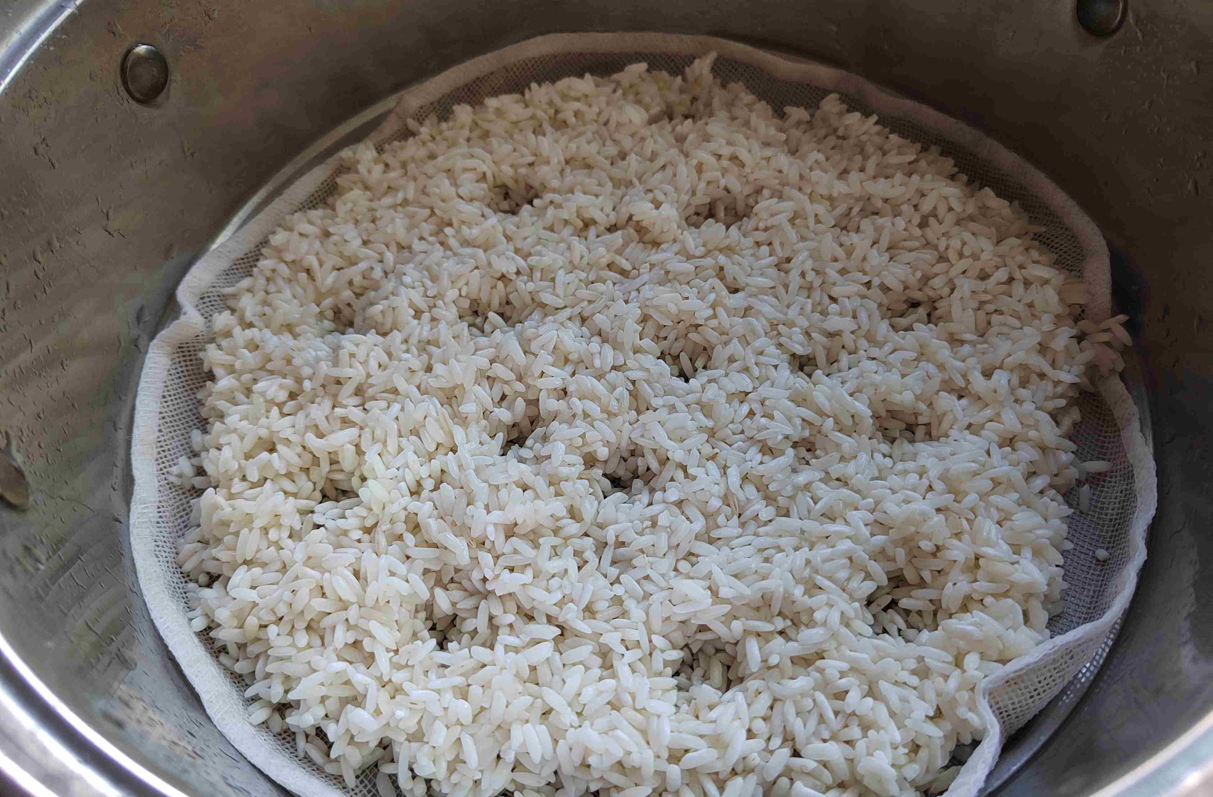 第二步:把糯米和大米淘洗干净,沥干水分,倒入蒸锅中,大火蒸40分钟,中间戳一些小孔,方便上汽。