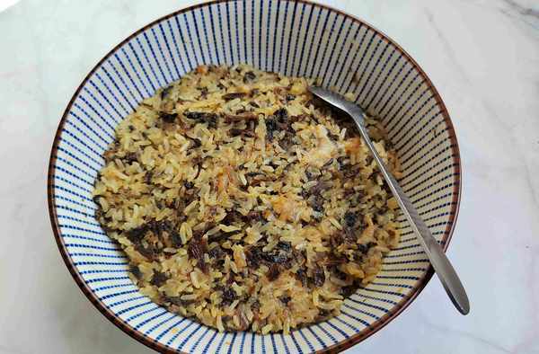 第五步:把蒸好的糯米饭和梅干菜倒入盘中,混合混匀,香喷喷的糯米馅就准备好啦!