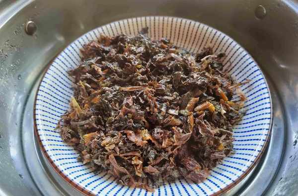 第三步:把梅干菜清洗干净,挤干水分。起锅烧油,放入梅干菜翻炒几分钟,把香味激发出来。炒好的梅干菜出锅装盘,放入蒸锅中,大火蒸10分钟。梅干菜有种特殊的香味,可以让人胃口大开,除了做烧麦以外,还可以用来蒸包子、蒸肉、炒豆角等等,吃法颇多。