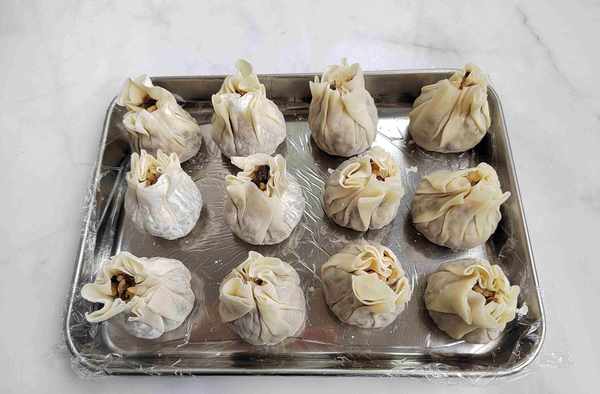 第八步:暂时不吃的烧麦,不需要蒸,直接放到冰箱冷冻3小时左右,再装入保鲜袋中,继续冷冻保存,这样早上就只要蒸一蒸就可以上桌了。冷冻保存的烧麦,收口合拢一点,避免散开,多蒸几分钟,口感会更好!