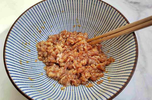 第四步:肉末装入一个大盘中,加入盐、生抽、蚝油、料酒,搅拌均匀。