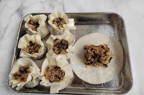 第六步:取一张现成的烧麦皮,加入适量糯米馅,用虎口收拢,做成烧麦的形状。