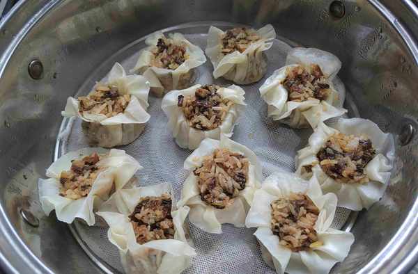 第七步:摆入蒸笼中,开水入锅,大火蒸12分钟,又香又糯的烧麦就可以出锅啦!趁热吃太香了!