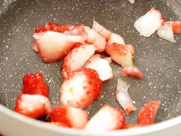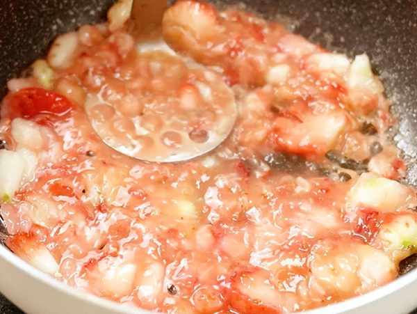 4、下面煮个草莓酱。洗干净的草莓去掉绿叶,切碎入锅熬煮,加点热水,熬至起泡绵绸。