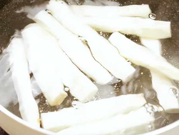 2、洗净的山药切成小段,切成长方形后,先下锅煮熟。