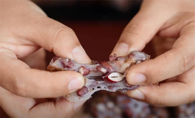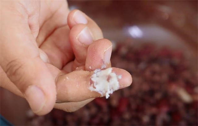 2.为了防止红豆吃进去太多的水分,影响后面的操作,我们可以用蒸的方式先蒸熟,红豆一定要多蒸一会儿,蒸到这样一碾就碎的状态是最好的。