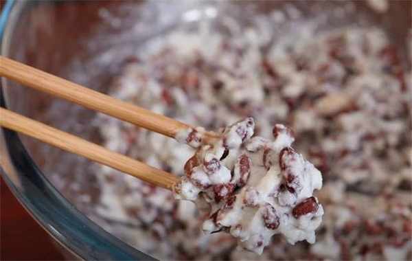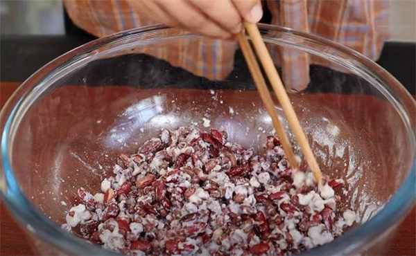 3.按照自己能吃甜的程度加白砂糖,简单搅匀之后加糯米粉,糯米粉可以增加黏糯的口感,为了怕过于粘牙,咱们可以少加一点面粉来中和一下口感,一直搅拌到每颗红豆都裹满了面粉,加一点清水增加黏性。