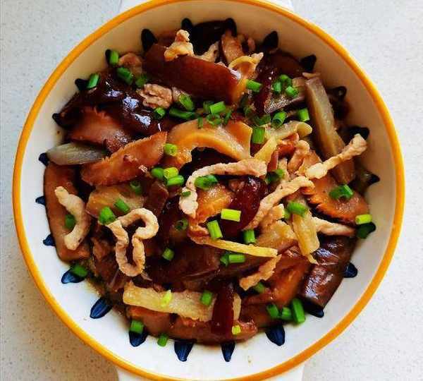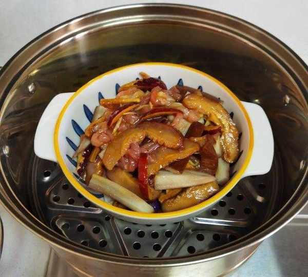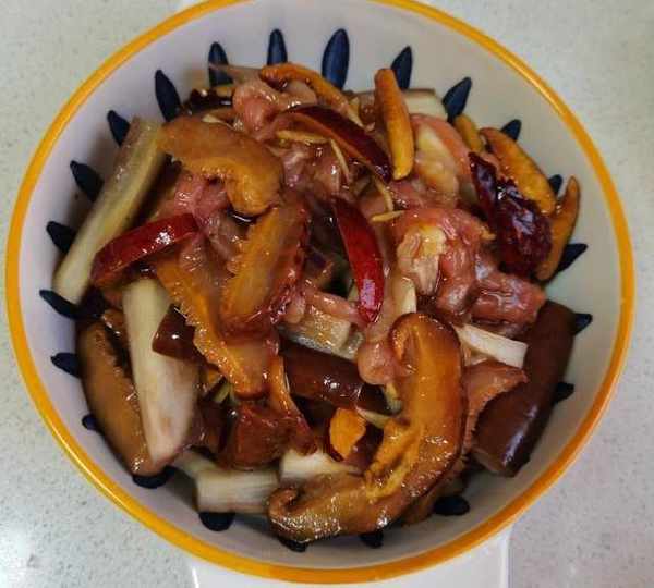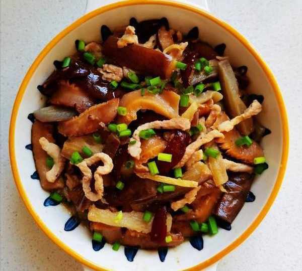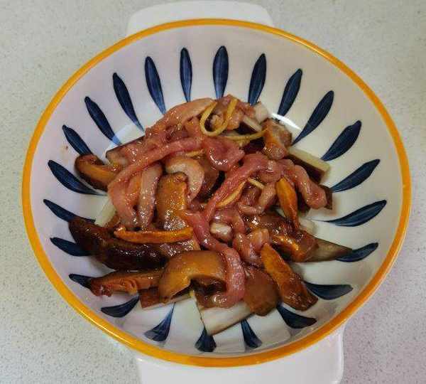 原料:茄子、里脊肉、红枣、生姜、干香菇、油、生抽、蚝油、盐、鸡精、白糖、水。