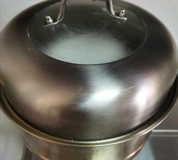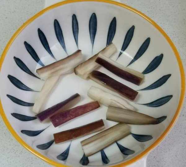 第4步、锅中倒水,水开后把茄子焯水一分钟。