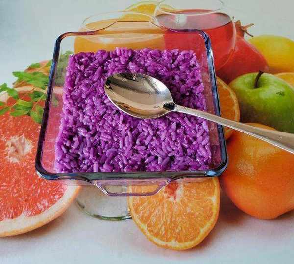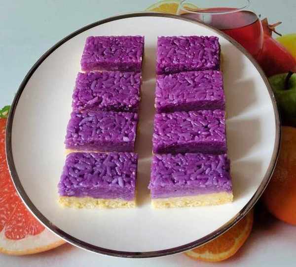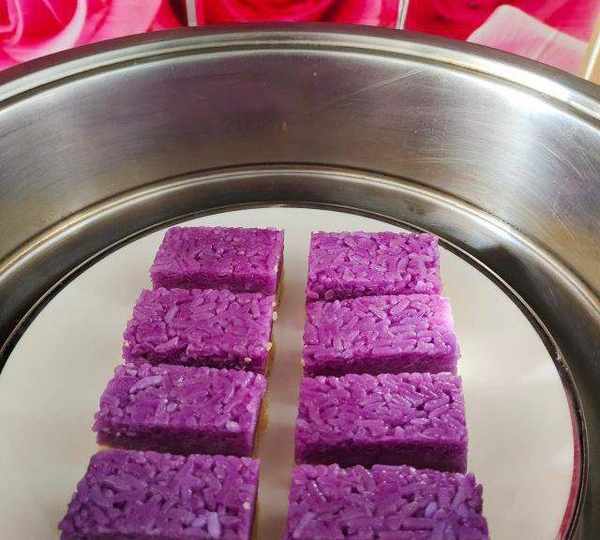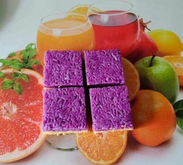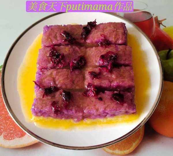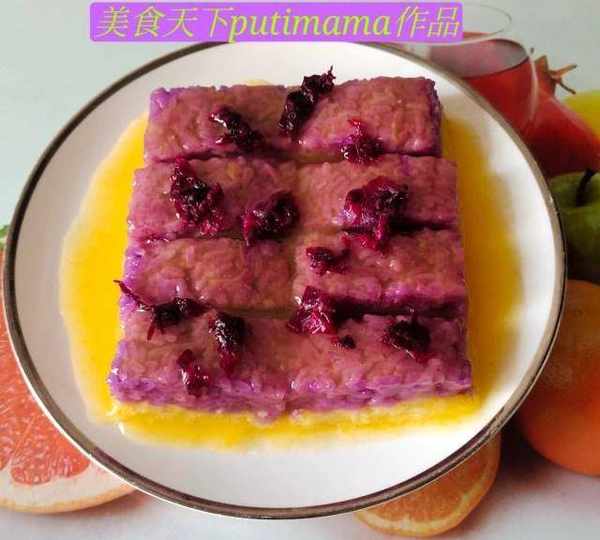 原料:云南紫糯米、大黄米、橘子榨汁、玫瑰花酱、白糖、淀粉水。