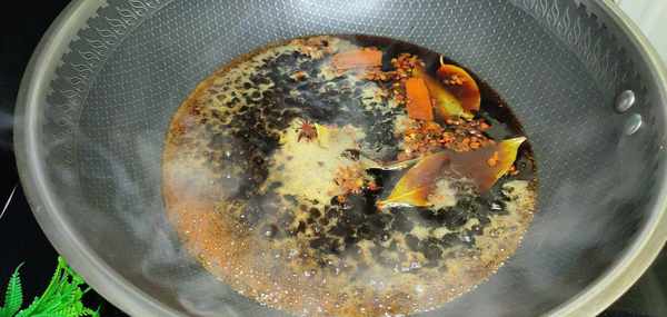 3、下面再熬个料汁:锅中加入桂平、大料、花椒、香叶、小火煸炒出香味,加入生抽一碗、香醋半碗、两碗清水、开锅后熬制5分钟关火,自然冷却再用。