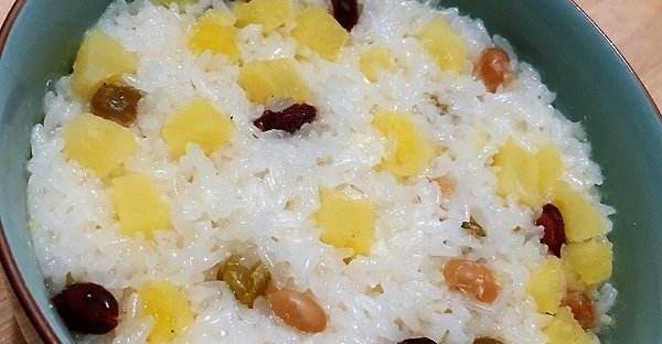 蒸熟的糯米饭,倒入盆中,加入少许白糖,猪油芝麻,拌匀,再放入少许的葡萄干大枣,随后将切碎的菠萝粒,到时候弄米饭,中一起拌匀。还可以自己搭配,加入喜欢的食材。