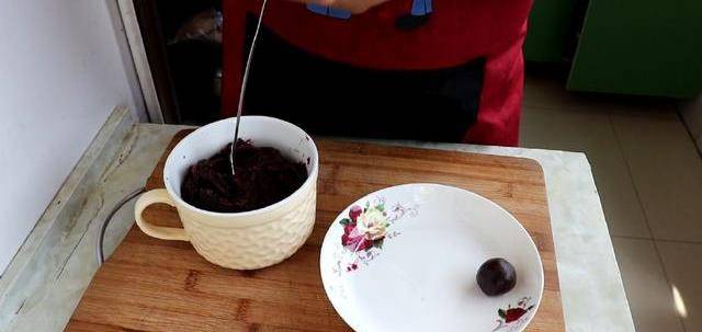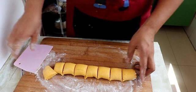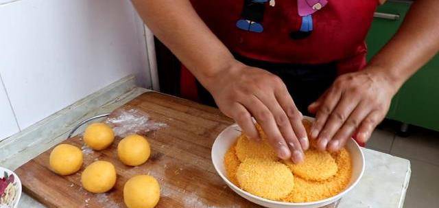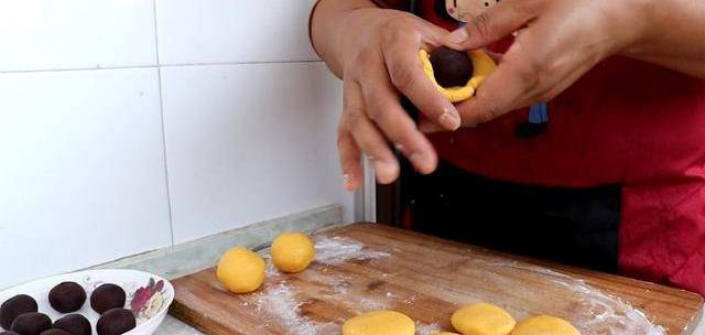 用手搓圆,再用手掌压扁,包上豆沙馅