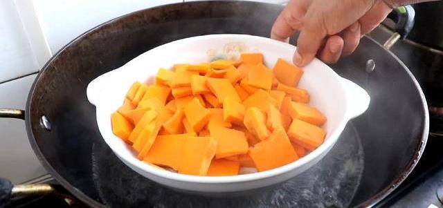 准备洗干净的南瓜削皮后全都切成薄片。然后上蒸锅蒸熟