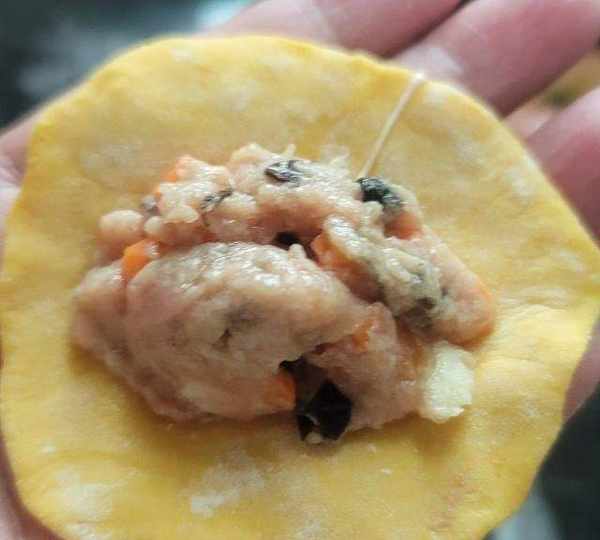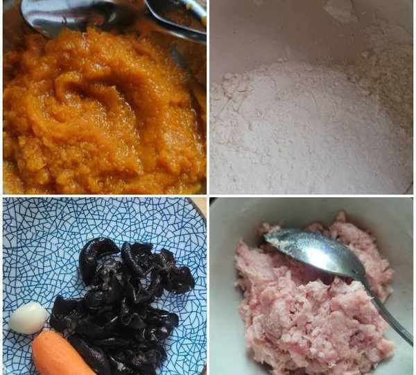 原料:南瓜泥、面粉、肉馅、胡萝卜、黑木耳、蒜头、香油、胡椒粉、糖、虾皮粉、酱油、盐。