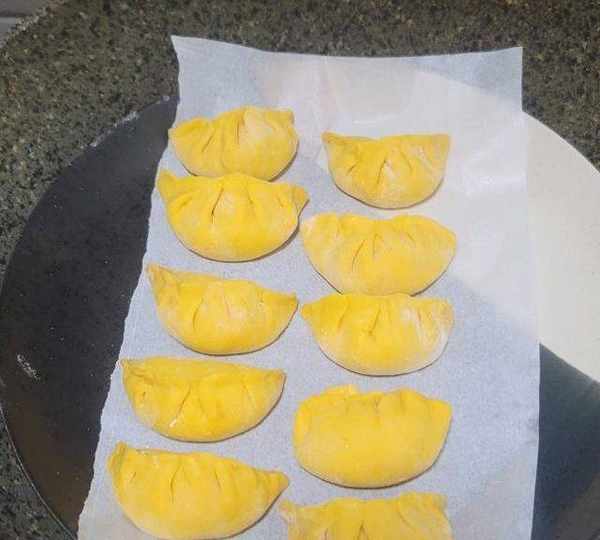 第9步、斟一张饺子皮放上适量的馅料按自己喜欢的包法依次包好。