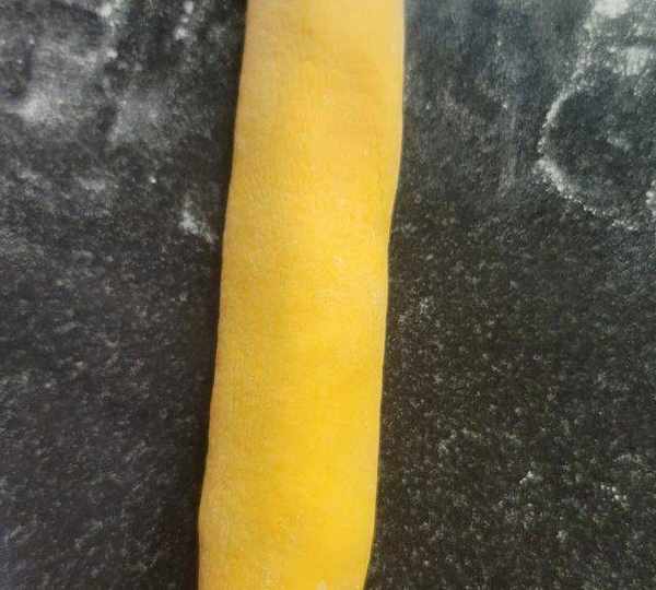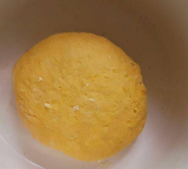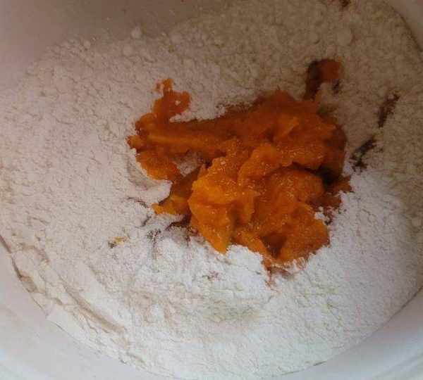 第2步、将南瓜泥放入面粉中,加少许盐搅拌均匀。
