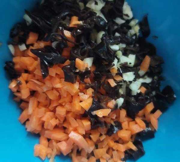 第4步、将胡萝卜,黑木耳,蒜头切成碎末。