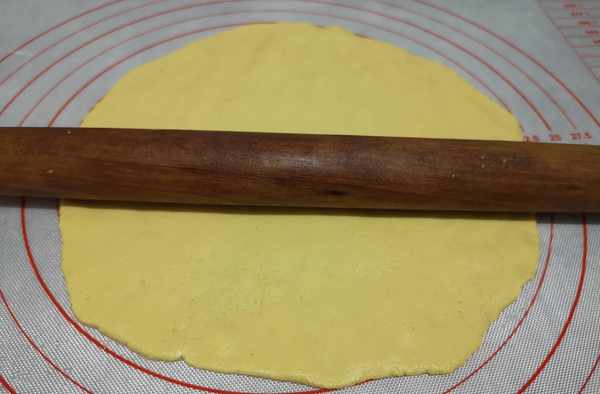 4、揉面垫撒上干粉,将面团放上,用擀面杖擀薄,擀的时候要轻一些,比较容易断开。