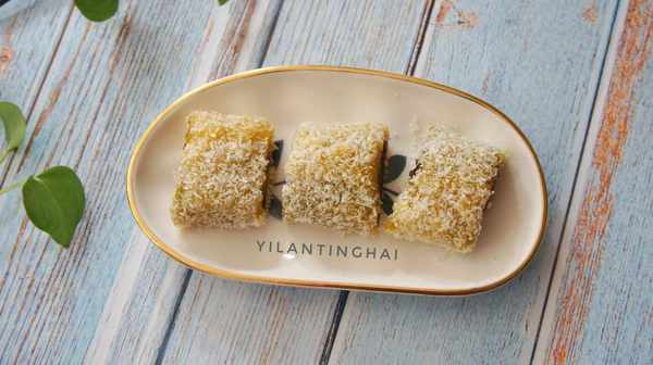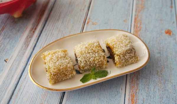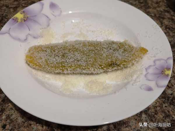 8、南瓜糯米卷蒸好后取出,放入准备好的椰蓉盘中,让南瓜糯米卷都沾上椰蓉。