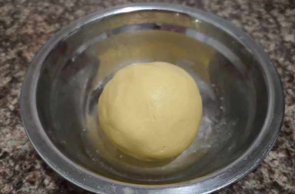 3、南瓜泥中加入糯米粉搅拌至无干粉的状态,揉成光滑不粘手的面团。