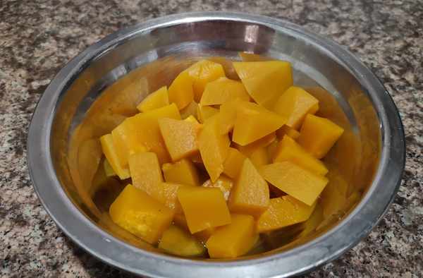 1、南瓜去皮去瓤,切成小块,放入烧开水的蒸锅,大概蒸15分钟,筷子能轻松插入即可。